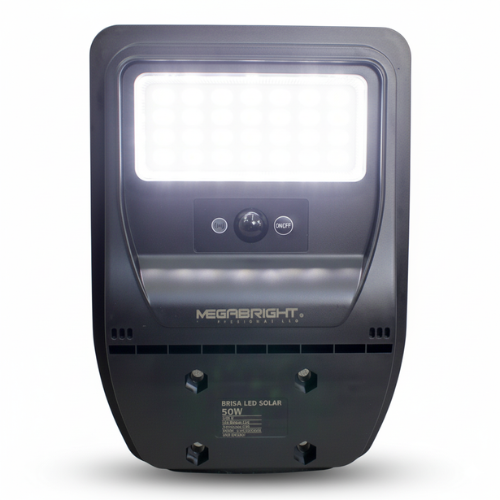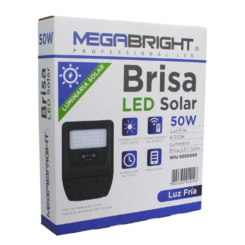 La luminaria Megabright Brisa LED Solar de 50W es una solución de alumbrado público eficiente y autónoma. Fabricada con tecnología LED de luz fría, ofrece un flujo lumínico de 600 Lm, ideal para espacios que requieren iluminación constante sin consumo eléctrico.